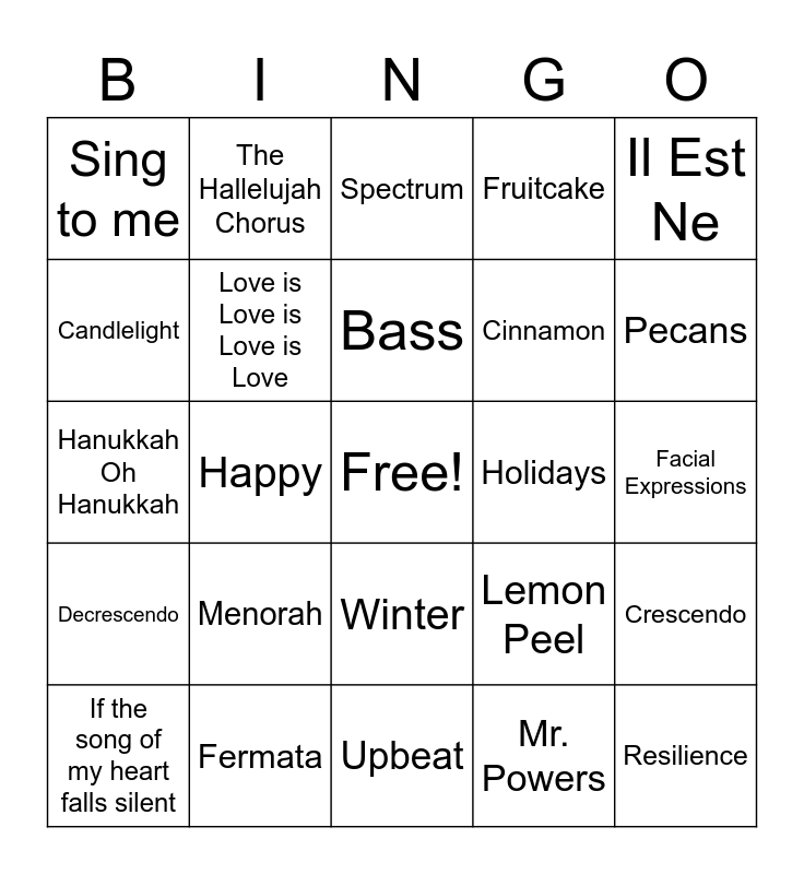 This bingo card has a free space and 75 words: Strength of Hope, Patriot Chorus, Spectrum, Bellissima, Patriot Sound, Voices of Freedom, ForteFy, Treble Voices, Sporano, Alto, Tenor, Baritone, Bass, Candlelight, Star Spangled Banner, Happy, Shout for Joy, Resilience, My Future, Il Est Ne, Rejoice With Exceeding Great Joy, Hanukkah Oh Hanukkah, Love is Love is Love is Love, The Hallelujah Chorus, Fruitcake, Songs From Silence, Music Visual Project, Conducting, Boomwhackers, TikTok Project, Write A Song Project, Song Exploder Podcast, Flour, Lemon Peel, Pecans, Cinnamon, Candied Cherries, Melodic Dictation, Facial Expressions, Mr. Powers, Treble Clef, Bass Clef, Quarter Note, Half Note, Eighth Note, Sixteenth Note, If the song of my heart falls silent, Sing to me, My heart remembers our song again, Annunciation, Ubi caritas et amor, Winter, Fall, Leah, Lulu, Jordana, Maia, Anne Sophie, Adriana, Maddie, Menorah, Latke, Dreidel, EPCOT, Disney, Holidays, A Capella, Piano, Forte, Crescendo, Decrescendo, Fermata, Downbeat, Upbeat and Time Signature.
