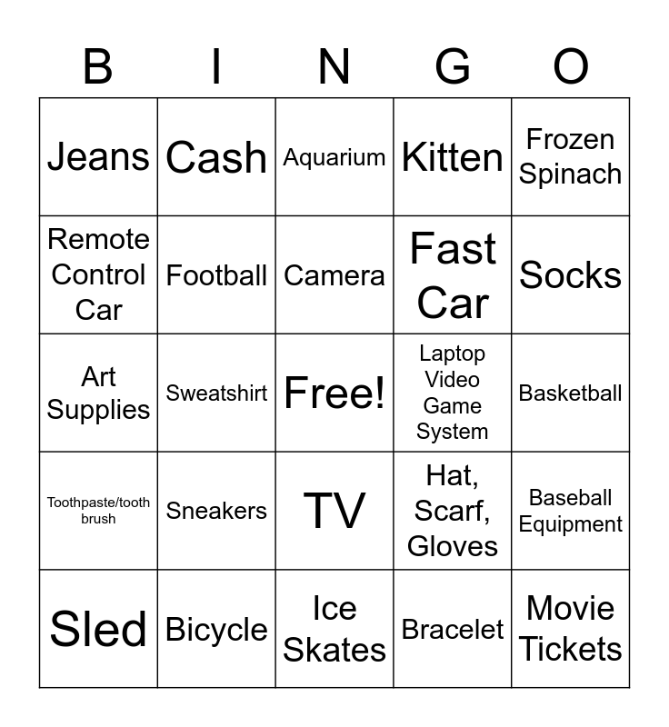 This bingo card has a free space and 34 words: Hover board, Bracelet, Puppy, Headphones, Toothpaste/tooth brush, Football, Frozen Spinach, Sled, Cash, Drone, Camera, Aquarium, Tickets to soccer game, Pony, Laptop Video Game System, Socks, Bicycle, Art Supplies, Sneakers, Hat, Scarf, Gloves, TV, Tablet or Ipad, Jeans, Basketball, Ice Skates, Movie Tickets, Kitten, Cellphone, Fast Car, Remote Control Car, Beef Jerky, Sweatshirt, Baseball Equipment and Apple Watch.