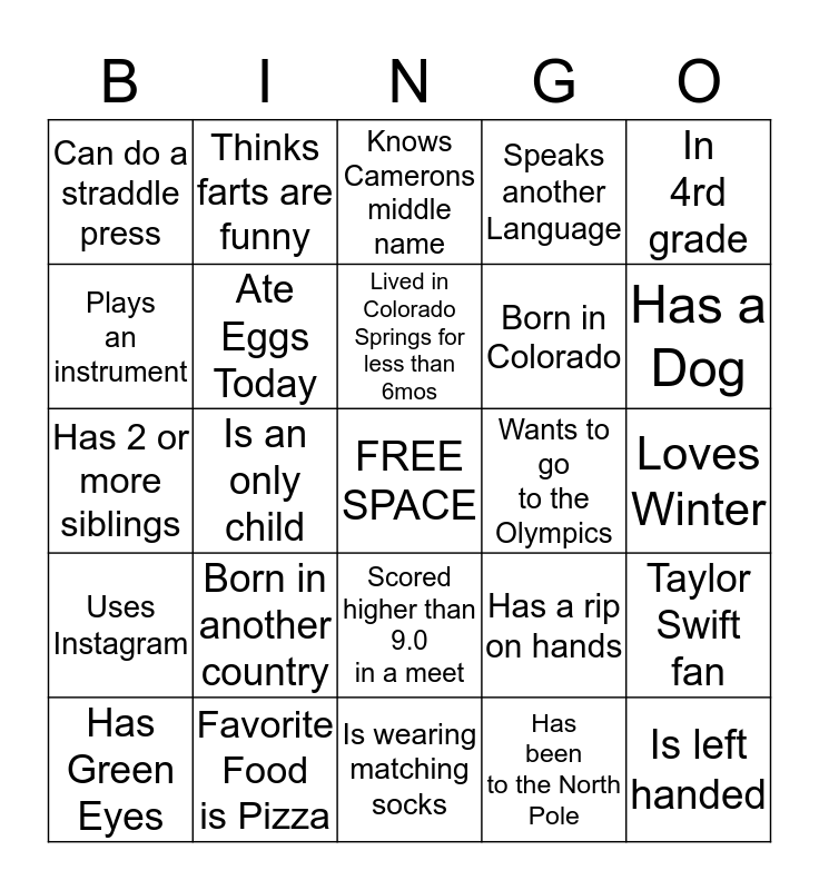 This bingo card has a free space and 24 words: Born in another country, Favorite Food is Pizza, Lived in Colorado Springs for less than 6mos, Has Green Eyes, In 4rd grade, Can do a straddle press, Plays an instrument, Thinks farts are funny, Wants to go to the Olympics, Scored higher than 9.0 in a meet, Born in Colorado, Has 2 or more siblings, Has a rip on hands, Taylor Swift fan, Ate Eggs Today, Has been to the North Pole, Loves Winter, Knows Camerons middle name, Has a Dog, Is an only child, Is left handed, Uses Instagram, Speaks another Language and Is wearing matching socks.