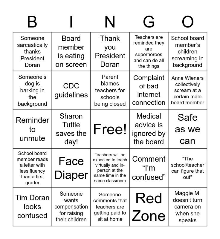 This bingo card has a free space and 24 words: Face Diaper, Someone wants compensation for raising their children, Parent blames teachers for schools being closed, Tim Doran looks confused, School board member’s children screaming in background, Someone sarcastically thanks President Doran, Someone’s dog is barking in the background, Board member is eating on screen, Medical advice is ignored by the board, Teachers will be expected to teach virtually and in-person at the same time in the same classroom, Complaint of bad internet connection, Reminder to unmute, Comment “I’m confused”, “The school/teacher can figure that out”, CDC guidelines, Red Zone, Safe as we can, Thank you President Doran, Anne Wieners collectively scream at a certain male board member, Sharon Tuttle saves the day!, Maggie M. doesn’t turn camera on when she speaks, School board member reads a letter with less fluency than a first grader, Teachers are reminded they are superheroes and can do all the things and Someone comments that teachers are getting paid to sit at home.
