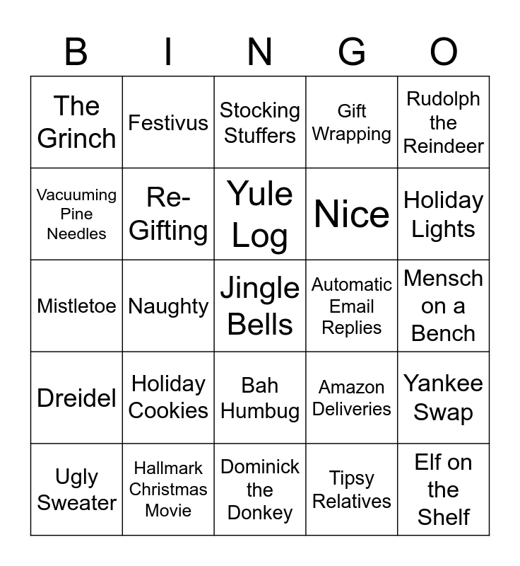 This bingo card has 30 words: Ugly Sweater, Nor'easter, Yule Log, Matching Pajamas, Rudolph the Reindeer, The Grinch, Festivus, Bah Humbug, Automatic Email Replies, Elf on the Shelf, Dreidel, Re-Gifting, Free!, Tipsy Relatives, Yankee Swap, Frosty the Snowman, Naughty, Jingle Bells, Amazon Deliveries, Holiday Lights, Mistletoe, Hallmark Christmas Movie, Stocking Stuffers, Nice, Mensch on a Bench, Vacuuming Pine Needles, Holiday Cookies, Dominick the Donkey, Gift Wrapping and Gingerbread House.