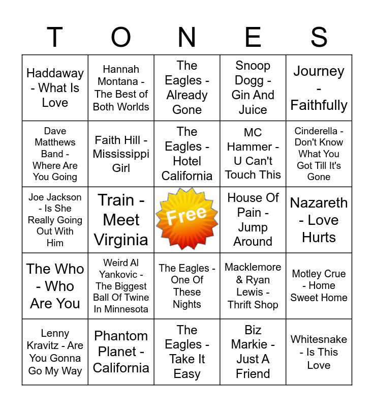 This bingo card has a free space and 75 words: Beach Boys - Wouldn't It Be Nice, Alabama - Mountain Music, The Eagles - Already Gone, 50 Cent - In Da Club, Aerosmith - I Don't Want to Miss a Thing, Bee Gees - How Deep Is Your Love, Arrested Development - Tennessee, The Eagles - Best Of My Love, Biz Markie - Just A Friend, Chicago - You're My Inspiration, Blink 182 - What's My Age Again?, Billy Joel - New York State Of Mind, House Of Pain - Jump Around, Cinderella - Don't Know What You Got Till It's Gone, Chicago - Does Anybody Really Know What Time It Is?, Faith Hill - Mississippi Girl, The Eagles - Heartache Tonight, Macklemore & Ryan Lewis - Thrift Shop, Guns N' Roses - Patience, Dave Matthews Band - Where Are You Going, Flo-rida feat. T-Pain - Low, The Eagles - Hotel California, MC Hammer - U Can't Touch This, Journey - Faithfully, Haddaway - What Is Love, George Strait - All My Ex's Live In Texas, The Eagles - I Can't Tell You Why, Naughty By Nature - Hip Hop Hooray, Journey - Open Arms, Jet - Are You Gonna Be My Girl, Grover Washington Jr. - Just The Two Of Us, The Eagles - Life In The Fast Lane, Nelly - Ride WIt Me, Motley Crue - Home Sweet Home, Joe Jackson - Is She Really Going Out With Him, Hannah Montana - The Best of Both Worlds, The Eagles - Lyin' Eyes, Salt-N-Pepa - Shoop, Nazareth - Love Hurts, Lenny Kravitz - Are You Gonna Go My Way, Jamie O'Neal - There Is No Arizona, The Eagles - New Kid In Town, Sir Mix-A-Lot - Baby Got Back, Poison - Every Rose Has Its Thorn, Marvin Gaye - What's Going On, John Mayer - Why Georgia, The Eagles - One Of These Nights, Snoop Dogg - Gin And Juice, Prince - Purple Rain, Men At Work - Who Can It Be Now, Kansas - Carry On My Wayward Son, The Eagles - Take It Easy, Snow - Informer, Queensryche - Silent Lucidity, Michelle Branch - Are You Happy Now, Ohio Players - Love Rollercoaster, The Eagles - Tequila Sunrise, Usher ft Lil' Jon & Ludacris - Yeah, Styx - Lady, Pixies - Where Is My Mind?, Phantom Planet - California, The Eagles - The Long Run, Vanilla Ice - Ice Ice Baby, The Cars - Drive, The Clash - Should I Stay Or Should I Go, Train - Meet Virginia, The Eagles - Wasted Time, Will Smith - Gettin Jiggy With It, Warrant - Heaven, The Who - Who Are You, Weird Al Yankovic - The Biggest Ball Of Twine In Minnesota, The Eagles - Witchy Woman, Young MC - Bust A Move, Whitesnake - Is This Love and The Eagles - Desperado.