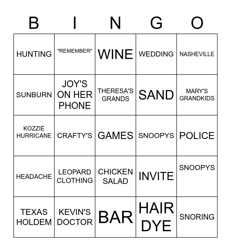 This bingo card has 32 words: HAIR DYE, SUE SHAW, CRAFTY'S, BEACH TRIP, HEADACHE, JOY'S ON HER PHONE, NASHEVILLE, SNOOPYS, "REMEMBER", SNORING, THERESA'S GRANDS, WINE, NO POLITICS, PSYCH PATIENT, SNOOPYS, CHEESE BALL, TEXAS HOLDEM, KOZZIE HURRICANE, CHICKEN SALAD, LEOPARD CLOTHING, INVITE, INITIATION, POLICE, KEVIN'S DOCTOR, GAMES, WEDDING, SAND, SUNBURN, HUNTING, BAR, WINE and MARY'S GRANDKIDS.