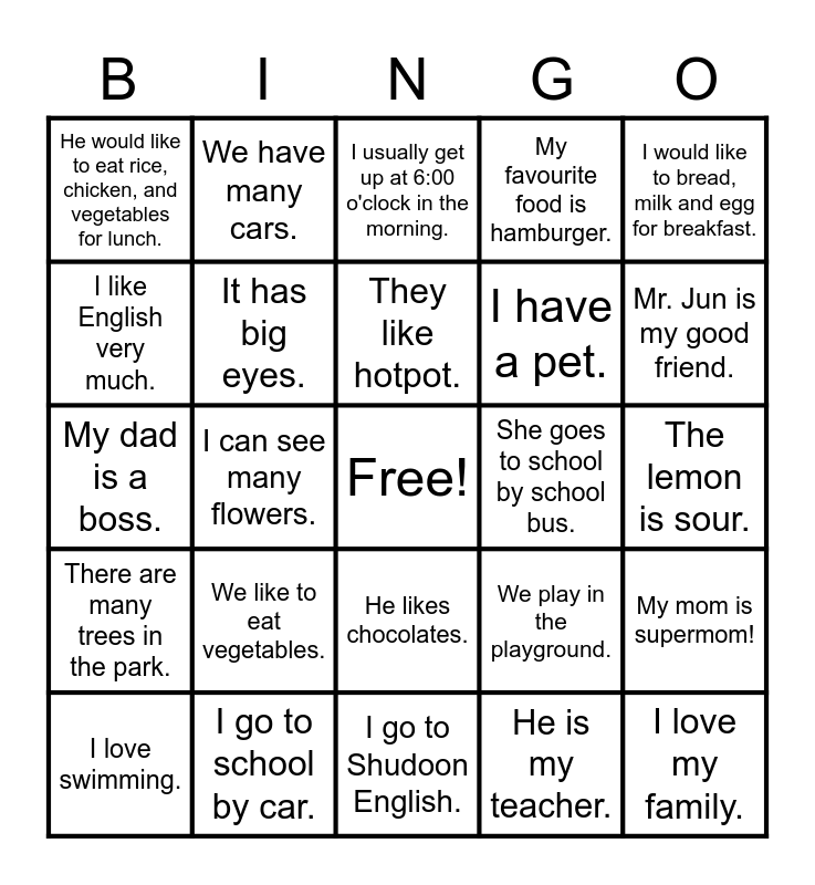 This bingo card has a free space and 34 words: My cat has long tail., I am ten years old., My school has many students., My teachers are very nice., The lemon is sour., I like English very much., It has big eyes., I go to Shudoon English., I have a pet., I love my family., My dad is a boss., We have many cars., He is my teacher., Tom has short hair., There are many trees in the park., I can see many flowers., He likes chocolates., She goes to school by school bus., My mom is supermom!, I love swimming., I go to school by car., I go to the park everyday., My favourite food is hamburger., Mr. Jun is my good friend., He goes to school by car., We like to eat vegetables., I usually get up at 6:00 o'clock in the morning., I go to bed at 10:00 o'clock., I would like to bread, milk and egg for breakfast., He would like to eat rice, chicken, and vegetables for lunch., She would like to eat rice, beef, and soup for dinner., They like hotpot., We play in the playground. and I like to play basketball..
