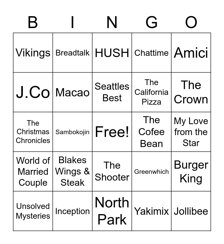 This bingo card has a free space and 48 words: Mang Inasal, Jollibee, McDonalds, North Park, Blakes Wings & Steak, Starbucks, Breadtalk, Ramen Nagi, J.Co, Frankies, Macao, Chattime, Burger King, Greenwhich, KFC, Black Scoop, Seattles Best, The Cofee Bean, Yellow Cab, Amici, Sambokojin, Yakimix, Vikings, The California Pizza, Desinated Survivor, The Crown, Unsolved Mysteries, Black Mirror, The Shooter, World of Married Couple, Panti Sisters, Twilight, 50 Shades of Grey, Cast Away, Inception, The Sinner, Extraction, My Love from the Star, The November Man, Sunod, The Platform, Casting JoBennet, HUSH, Ocean's 8, The Christmas Chronicles, Rotten, Chef's Table and Close.