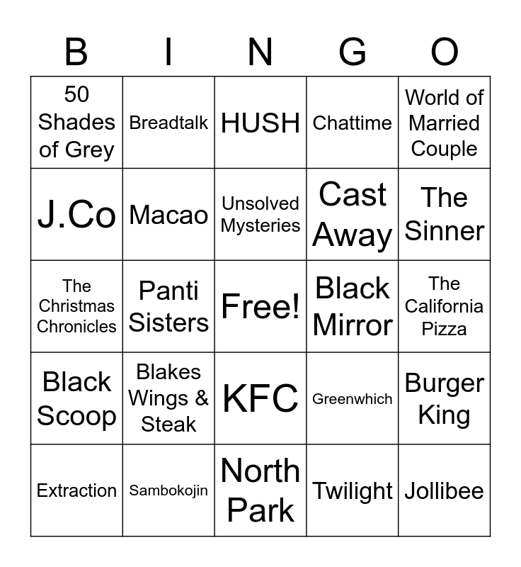This bingo card has a free space and 48 words: Mang Inasal, Jollibee, McDonalds, North Park, Blakes Wings & Steak, Starbucks, Breadtalk, Ramen Nagi, J.Co, Frankies, Macao, Chattime, Burger King, Greenwhich, Desinated Survivor, The Crown, Unsolved Mysteries, Black Mirror, The Shooter, World of Married Couple, Panti Sisters, Twilight, 50 Shades of Grey, Cast Away, Inception, The Sinner, Extraction, My Love from the Star, KFC, Black Scoop, Seattles Best, The Cofee Bean, Yellow Cab, Amici, Sambokojin, Yakimix, Vikings, The California Pizza, The November Man, Sunod, The Platform, Casting JoBennet, HUSH, Ocean's 8, The Christmas Chronicles, Rotten, Chef's Table and Close.