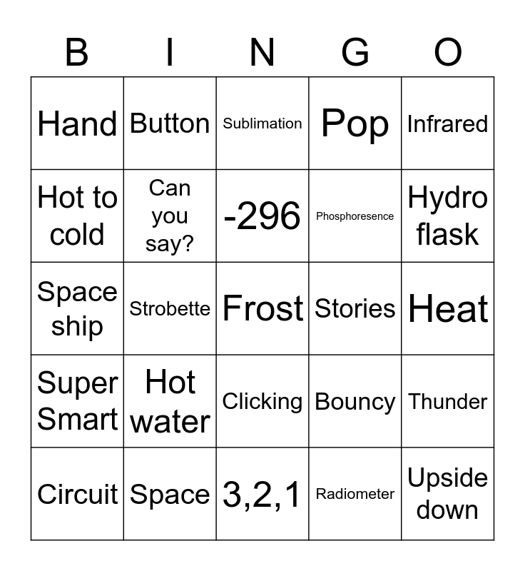 This bingo card has 26 words: Clicking, Radiometer, -296, Space, Infrared, Hand, Hot to cold, Button, Heat, Bouncy, Phosphoresence, Space ship, Thunder, Circuit, Strobette, Safe, Pop, Super Smart, Sublimation, Frost, Hydro flask, 3,2,1, Stories, Hot water, Can you say? and Upside down.