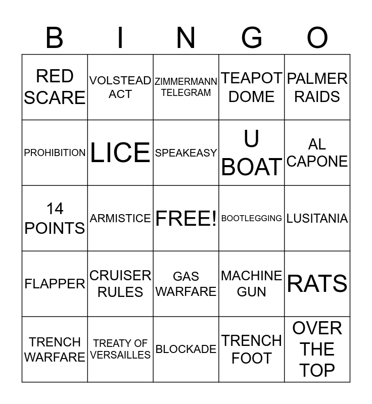 This bingo card has a free space and 24 words: CRUISER RULES, TREATY OF VERSAILLES, SPEAKEASY, TRENCH WARFARE, PALMER RAIDS, RED SCARE, PROHIBITION, VOLSTEAD ACT, BOOTLEGGING, GAS WARFARE, U BOAT, 14 POINTS, MACHINE GUN, RATS, LICE, TRENCH FOOT, LUSITANIA, ZIMMERMANN TELEGRAM, AL CAPONE, ARMISTICE, OVER THE TOP, FLAPPER, TEAPOT DOME and BLOCKADE.