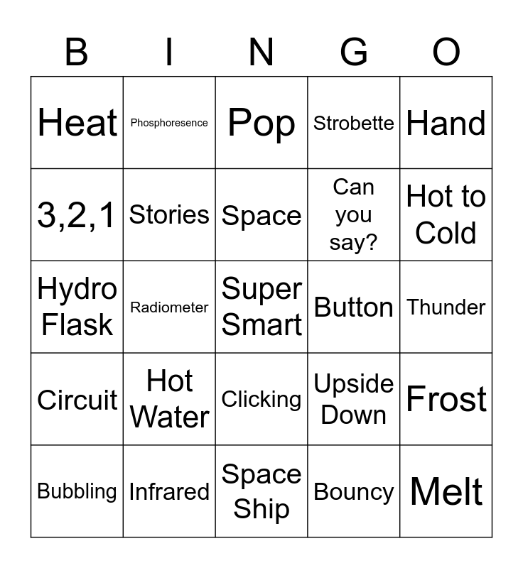 This bingo card has 26 words: Clicking, Bouncy, Space, Infrared, Hand, Heat, 3,2,1, Phosphoresence, Thunder, Upside Down, Can you say?, Hydro Flask, Frost, Bubbling, Radiometer, Safe, Strobette, Circuit, Pop, Super Smart, Hot to Cold, Space Ship, Button, Hot Water, Stories and Melt.