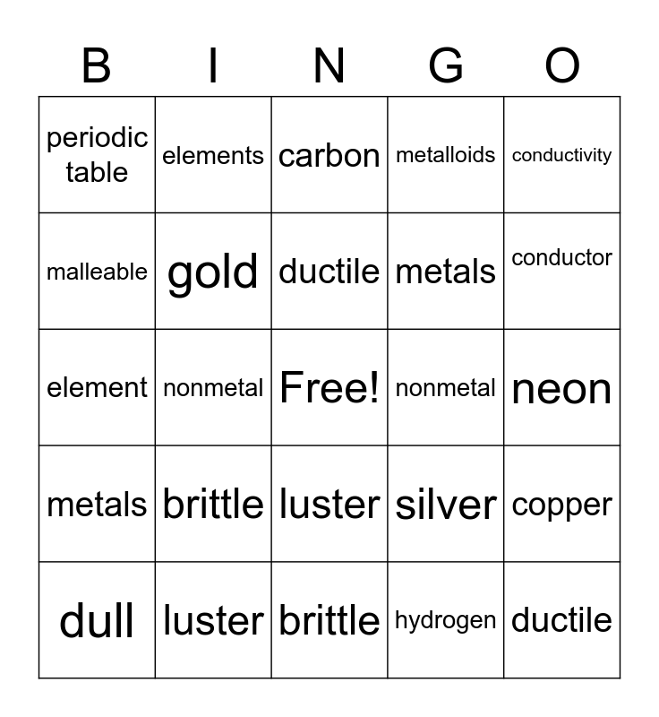 This bingo card has a free space and 24 words: brittle, luster, ductile, dull, conductivity, periodic table, malleable, elements, nonmetal, luster, metals, element, silver, copper, gold, hydrogen, neon, carbon, conductor, nonmetal, ductile, metals, metalloids and brittle.