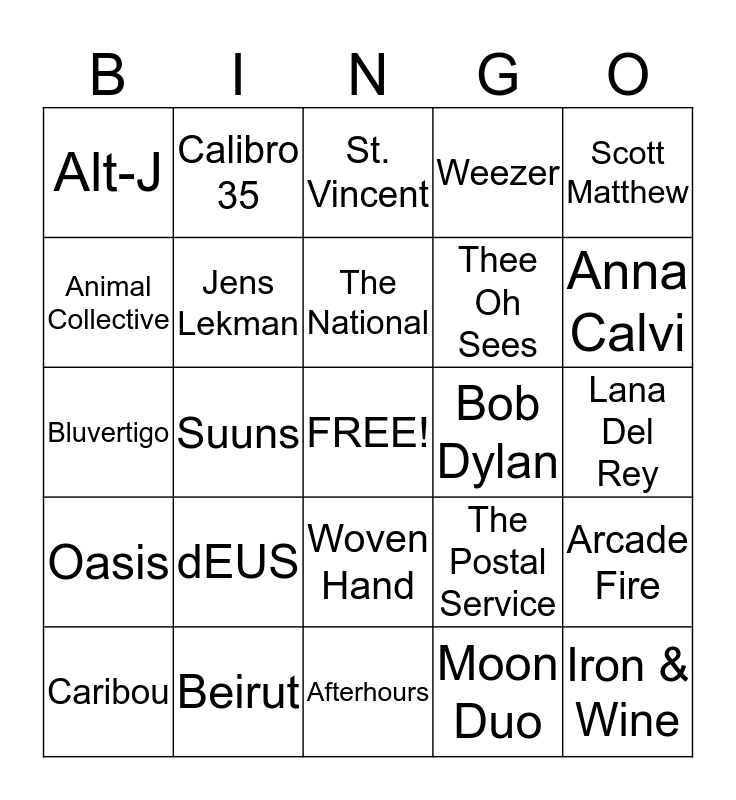 This bingo card has a free space and 90 words: Damien Jurado, Strand Of Oaks, Woven Hand, Daniel Norgren, Helmet, The Black Keys, The Black Lips, Johnny Cash, Elvis Presley, Micah P. Hinson, The Smiths, Joy Division, The Strokes, Lana Del Rey, The White Stripes, The National, Neutral Milk Hotel, David Bowie, Arctic Monkeys, Dente, Dirty Beaches, Marta Sui Tubi, Afterhours, Franz Ferdinand, Bluvertigo, Beirut, Interpol, Rolling Stones, The Beatles, Placebo, The Doors, Arcade Fire, The Libertines, Oasis, Alt-J, Weezer, St. Vincent, Swans, Suuns, Anna Calvi, Caribou, Animal Collective, Tame Impala, Moderat, Fischerspooner, The Postal Service, Clap Your Hands! Say Yeah, OvO, The Veils, The Tallest Man On Earth, The War On Drugs, Thee Oh Sees, The Black Angels, Liars, Nick Cave, Neil Young, Bob Dylan, M.I.A., MGMT, Akron/Family, Massimo Volume, Lady Gaga, Daft Punk, Grimes, Django Django, Balmorhea, Of Montreal, Moon Duo, Be Forest, M+A, dEUS, Iron & Wine, Pontiak, The Pains Of Being Pure At Heart, Calibro 35, Jens Lekman, Patrick Wolf, Diaframma, Mudhoney, Shout Out Louds, I'm From Barcelona, Scott Matthew, M Ward, Pink Mountaintops, His Clancyness, Wooden Shjips, Offlaga Disco Pax, Deerhoof, The Dream Syndicate and Bombino.