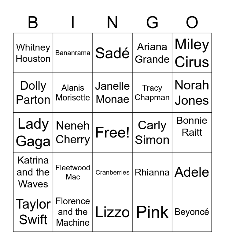 This bingo card has a free space and 25 words: Fleetwood Mac, Lizzo, Janelle Monae, Taylor Swift, Miley Cirus, Whitney Houston, Dolly Parton, Bananrama, Carly Simon, Cranberries, Tracy Chapman, Lady Gaga, Rhianna, Adele, Alanis Morisette, Fiona Apple, Bonnie Raitt, Sadé, Norah Jones, Neneh Cherry, Beyoncé, Florence and the Machine, Katrina and the Waves, Ariana Grande and Pink.