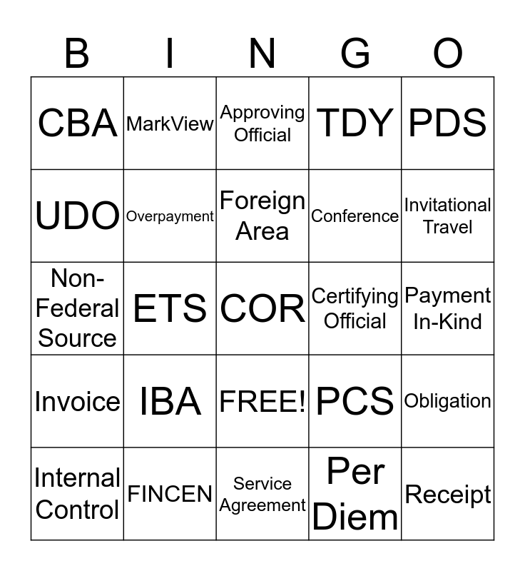 This bingo card has 26 words: FREE!, Per Diem, Foreign Area, FINCEN, PDS, CBA, UDO, MarkView, Payment In-Kind, PCS, Conference, Non-Federal Source, Obligation, Internal Control, ETS, PPA, TDY, Invoice, Approving Official, COR, Invitational Travel, Service Agreement, Certifying Official, IBA, Overpayment and Receipt.