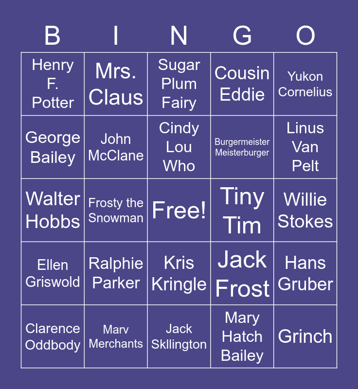 This bingo card has a free space and 46 words: Ebenezer Scrooge, Grinch, Kevin McCallister, Jack Skllington, Ralphie Parker, Rudolph, Mrs. Claus, Buddy the Elf, George Bailey, Scott Calvin, John McClane, Cousin Eddie, Hans Gruber, Jack Frost, Clark Griswold, Charlie Brown, Cindy Lou Who, Tiny Tim, Turbo Man, Yukon Cornelius, Frosty the Snowman, Mary Hatch Bailey, Henry F. Potter, Burgermeister Meisterburger, Hermie the Elf, Linus Van Pelt, Clarence Oddbody, Elf on a Shelf, Kris Kringle, Ellen Griswold, Susan Walker, Gizmo, Jingle Belle, Scut Farkus, King Moonracer, Marv Merchants, Willie Stokes, Bumble the Abominable Snowman, Arthur Christmas, Max, Papa Elf, Sugar Plum Fairy, Walter Hobbs, Ghost of Christmas Present, Ghost of Christmas Past and Ghost of Christmas Yet to Come.