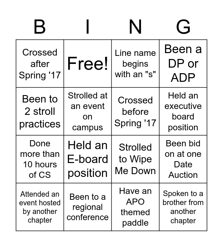 This bingo card has 19 words: Strolled to Wipe Me Down, Have nalia worth over $100, Line name begins with an "s", Spoken to a brother from another chapter, Been bid on at one Date Auction, Been to 2 stroll practices, Have an APO themed paddle, Crossed after Spring '17, Free!, Done more than 10 hours of CS, Held an E-board position, Strolled at an event on campus, Crossed before Spring '17, Been to a regional conference, Attended an event hosted by another chapter, Been to 2 or more DJ Battles, Been a DP or ADP, Held an executive board position and Attended iLead or We Lead.
