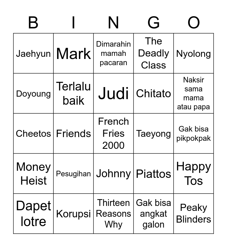 This bingo card has a free space and 24 words: Pesugihan, Korupsi, Judi, Dapet lotre, Nyolong, Jaehyun, Doyoung, Mark, Taeyong, Johnny, Chitato, Cheetos, Piattos, Happy Tos, Terlalu baik, Gak bisa angkat galon, Gak bisa pikpokpak, Dimarahin mamah pacaran, Naksir sama mama atau papa, Friends, Peaky Blinders, Money Heist, The Deadly Class and Thirteen Reasons Why.