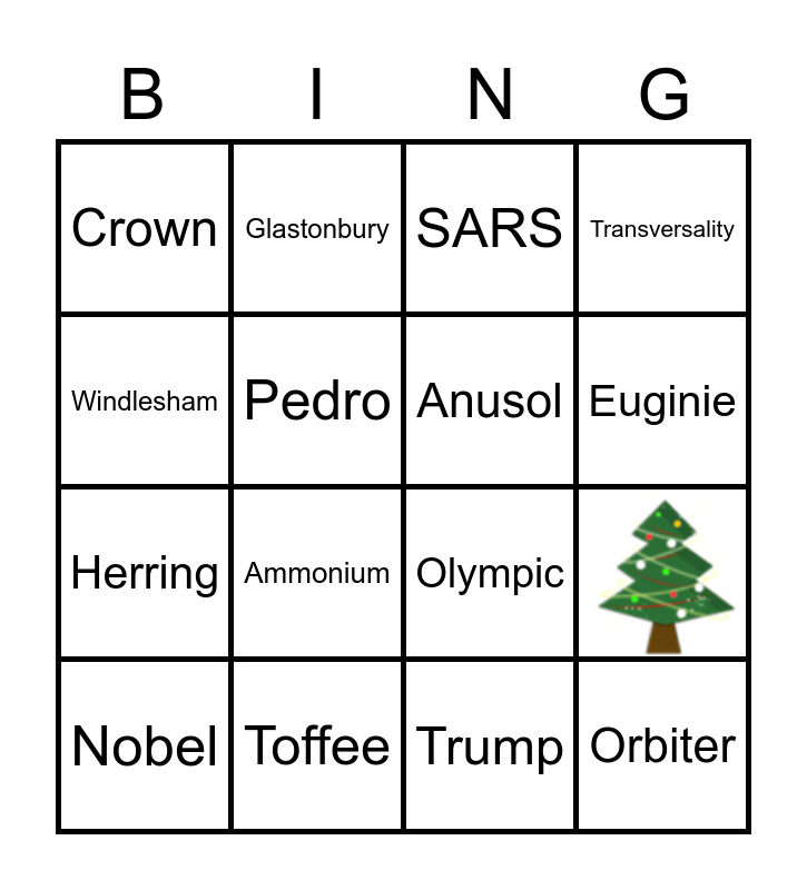 This bingo card has 1 images and 36 words: Free!, Antibody, Cimzia, Anusol, Ypres, Flanders, Euginie, Royal, Windlesham, Erectile, Transversality, Nobel, Trump, Pedro, Orbiter, Manatees, SARS, Italy, Toffee, Crown, Ammonium, Parasite, Alistair, Remdesivir, Elton, Glastonbury, Musk, Nepotism, Virgin, Tweets, Pudding, Olympic, Flipping, Sherlock, Herring and Discovery.