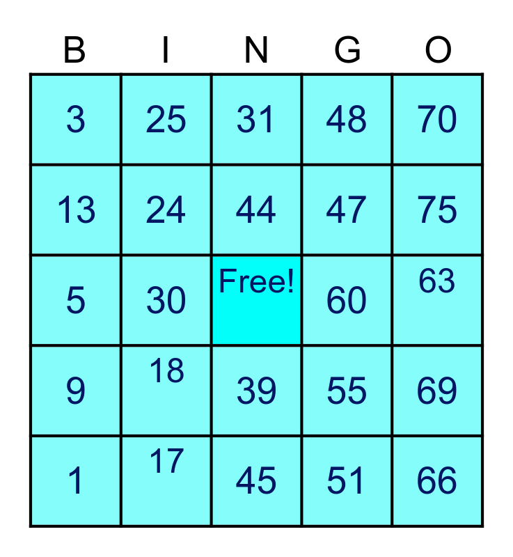 This bingo card has a free space and 24 words: 1, 18, 44, 51, 70, 3, 25, 31, 60, 63, 5, 24, 55, 69, 13, 17, 45, 48, 75, 9, 30, 39, 47 and 66.