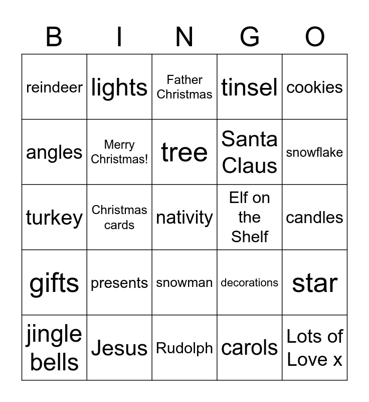This bingo card has a free space and 24 words: jingle bells, presents, tree, carols, cookies, reindeer, lights, Father Christmas, Elf on the Shelf, candles, turkey, Merry Christmas!, decorations, star, angles, Jesus, Rudolph, tinsel, snowflake, gifts, Christmas cards, snowman, Santa Claus and Lots of Love x.