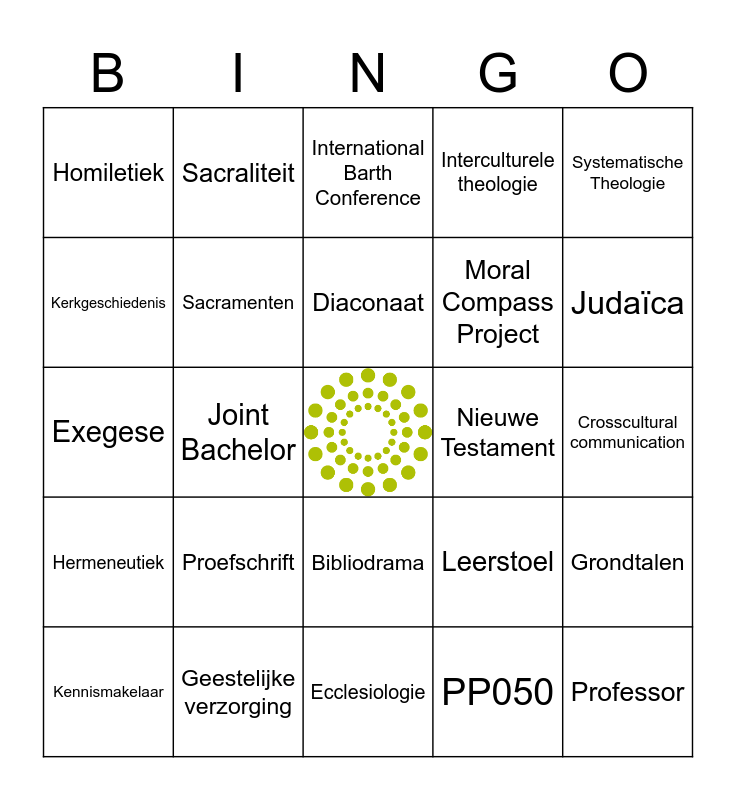 This bingo card has a free space and 90 words: Ambt, Avondmaal, Bibliodrama, Bijbelwetenschap, Bridging Gaps, Bureau Studentenzaken, Calvijn, Catechetiek, CBS, Christendom, Collaborative Research, Connecting Churches and Cultures, Contextueel Bijbellezen, Crosscultural communication, Cursuscatalogus, Diaconaat, Dispuut, Dogmatiek, Dominee, Doop, Dorpskerken, Drie-eenheid, Ecclesiologie, Ethiek, Exegese, Geestelijke verzorging, Geloof, Genderstudies, Gnostiek, Godsdienstfilosofie, Grieks, Grondtalen, Hebreeuws, Hermeneutiek, Homiletiek, Interculturele theologie, International Barth Conference, IRiIiS, Joint Bachelor, Judaïca, Kennismakelaar, Kerkgeschiedenis, Kerkmuziek, Kerkrecht, Leerstelling, Leerstoel, Latijn, Liturgie(k), Luther, Mediating Good Life, Missiologie, Moral Compass Project, Moving Identities, Mozaïek van kerkplekken, Nieuw Hydepark, Nieuw Kerkelijk Peil, Nieuwe Testament, OBP, Oecumenica, OJKC, Onderwijs, Onderzoek, Osiris, Oude Testament, Pastoraat, Pneumatologie, Poimeniek, PP050, Praktische Theologie, Predikant, Proefschrift, Professor, Promovendus, Ritueel, Sacraliteit, Sacramenten, Schepping, Schrift, Scriptorium, Secularisatie, Spiritualiteit, Systematische Theologie, Theoloog, Transcendentie, UHD, Valorisatie, Voedsel, Wetenschap, Youth Ministry and Zingeving.