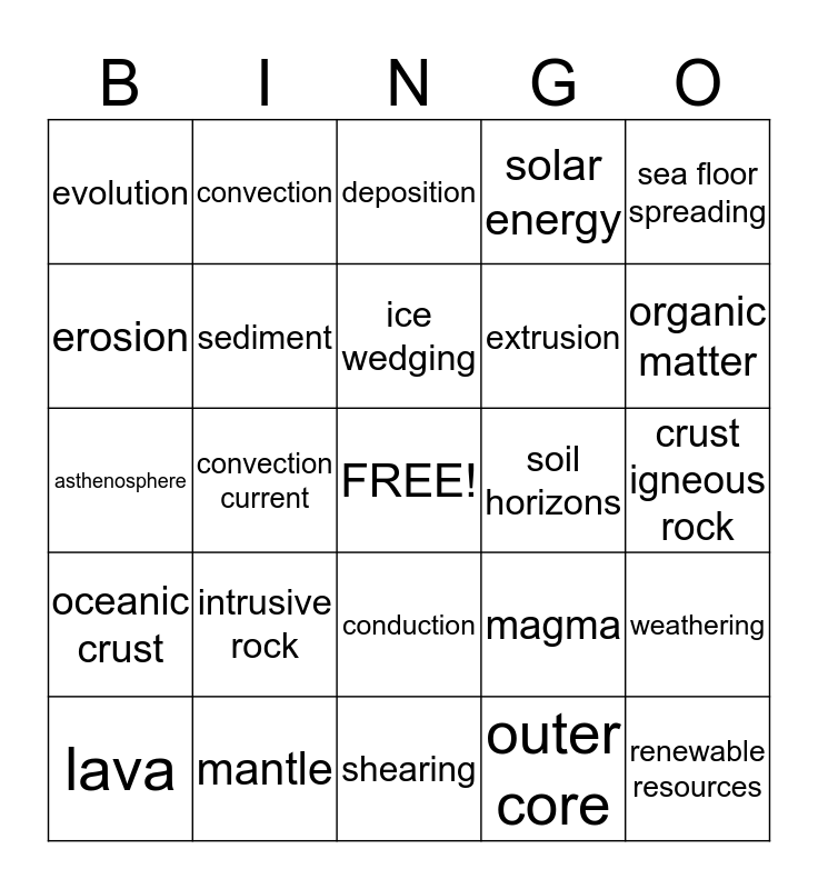 This bingo card has a free space and 59 words: compression, mantle, relative age/dating, oceanic crust, outer core, cementation, sediment, subduction, extrusion, radiation, solar energy, transform boundary, erosion, divergent boundary, creep, evolution, renewable resources, sea floor spreading, metamorphic rock, ice wedging, soil horizons, deposition, lava, weathering, Biomass, paleontologist, stress, contour plowing, organic matter, non-renewable resources, energy conservation, fossil, sedimentary rock, extinction, convection, pangea, fossil fuels, convection current, humus, asthenosphere, inner core, intrusive rock, crust igneous rock, fault, index fossil, extrusive igneous rock, wind energy, geological time scale, conduction, shearing, chemical weathering, mass movement, non-foliated, trench, convergent boundary, magma, lithosphere, compaction and mid-ocean ridge.