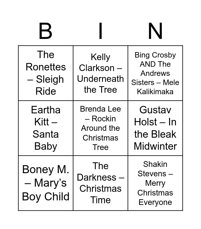 This bingo card has 27 words: Free!, Mariah Carey – All I Want For Christmas is You, Shakin Stevens – Merry Christmas Everyone, Gayla Peevey – I Want a Hippopotamus for Christmas, Gustav Holst – In the Bleak Midwinter, Bing Crosby AND The Andrews Sisters – Mele Kalikimaka, Kelly Clarkson – Underneath the Tree, Jackson 5 – Frosty the Snowman, Andy Williams – The Most Wonderful Time of the Year, Michael Bublé – Christmas (Baby Please Come Home), Frank Sinatra – White Christmas, Eartha Kitt – Santa Baby, Wham! – Last Christmas, The Pogues – Fairytale of New York, Slade – Merry Xmas Everybody, Jona Lewie – Stop the Cavalry, Boney M. – Mary’s Boy Child, The Darkness – Christmas Time, Mud – Lonely This Christmas, The Ronettes – Sleigh Ride, Nat King Cole – The Christmas Song, Wizzard – I Wish It Could Be Christmas, Band Aid – Do The Know It’s Christmas, Destiny's Child – 8 Days of Christmas, Dean Martin – Let it Snow, Let it Snow, Let it Snow!, Brenda Lee – Rockin Around the Christmas Tree and The Weavers – We Wish you a Merry Christmas.