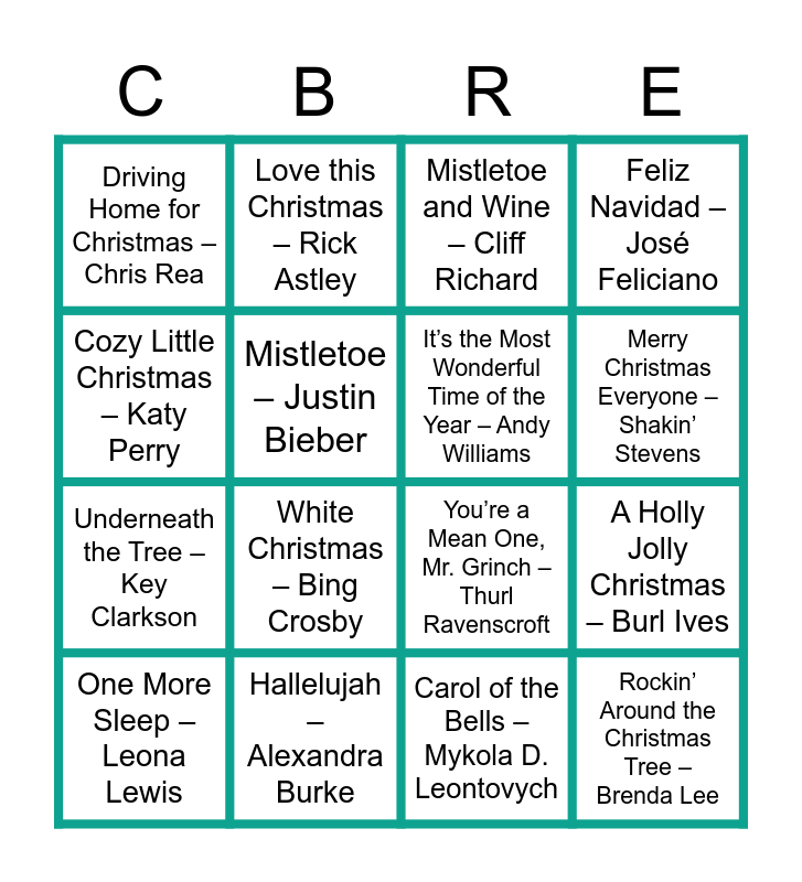 This bingo card has 59 words: All I Want for Christmas Is You – Mariah Carey, Last Christmas – Wham, Santa Tell Me – Ariana Grande, Rockin’ Around the Christmas Tree – Brenda Lee, It’s Beginning to Look a Lot Like Christmas – Bing Crosby, Jingle Bell Rock – Bobby Helms, It’s the Most Wonderful Time of the Year – Andy Williams, Let it Snow – Dean Martin, Underneath the Tree – Key Clarkson, Sleigh Ride – The Ronettes, Feliz Navidad – José Feliciano, Holly Jolly Christmas – Michael Bublé, Mistletoe – Justin Bieber, Wonderful Christmastime – Paul McCartney, Do They Know It’s Christmas? – Band Aid, Driving Home for Christmas – Chris Rea, One More Sleep – Leona Lewis, Cozy Little Christmas – Katy Perry, Stay Another Day – East 17, Merry Christmas Everyone – Shakin’ Stevens, Hallelujah – Alexandra Burke, Mistletoe and Wine – Cliff Richard, Mary’s Boy Child – Boney M., Merry Christmas Everybody – Slade, Happy Xmas (War is Over) – John Lennon, Fairytale of New York – The Pogues, What Christmas Means to Me – Hanson, Santa Claus is Coming to Town – The Jackson 5, White Christmas – Bing Crosby, Candy Cane Lane – Sia, Santa’s Coming For Us – Sia, Incredible Christmas – Gary Barlow, 2000 Miles – Pretenders, Blue Christmas – Elvis Presley, Love this Christmas – Rick Astley, Rudolph the Red-Nosed Reindeer – Burl Ives, Have Yourself a Merry Little Christmas – Frank Sinatra, A Holly Jolly Christmas – Burl Ives, Dominick The Donkey – Lou Monte, You’re a Mean One, Mr. Grinch – Thurl Ravenscroft, Frosty The Snowman – Jimmy Durante, Here Comes Santa Claus – Gene Autry, Carol of the Bells – Mykola D. Leontovych, Santa Baby – Eartha Kitt, The Little Drummer Boy – Harry S. Chorale, Do you Hear What I Hear? – Bing Crosby, Santa Clause is Comin’ to Town – Frank Sinatra, Hark! The Herald Angels Sing – Choir, Silent Night, Holy Night – Choir, Ding Dong! Merrily On High – Choir, Please Come Home For Christmas – Jon Bon Jovi, When You Wish Upon A Star – The Mamas, Baby, It’s Cold Outside – Steve Lawrence/Eydie Gorme, Man With The Bag – Stephanie’s Child, I Saw Mommy Santa Claus – Jackson 5, One Wish – Whitney Houston, Twelve Days of Christmas – John Denver/The Muppets, We Three Kings – George Strait and Silver Bells – Bing Crosby/Carol Richard.