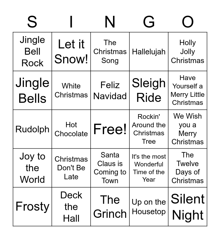 This bingo card has a free space and 24 words: Christmas Don't Be Late, Deck the Hall, Feliz Navidad, Frosty, Holly Jolly Christmas, Jingle Bell Rock, Jingle Bells, Let it Snow!, Rockin' Around the Christmas Tree, Santa Claus is Coming to Town, Sleigh Ride, Rudolph, It's the most Wonderful Time of the Year, The Twelve Days of Christmas, White Christmas, Up on the Housetop, We Wish you a Merry Christmas, The Christmas Song, Have Yourself a Merry Little Christmas, Hot Chocolate, Silent Night, Joy to the World, Hallelujah and The Grinch.