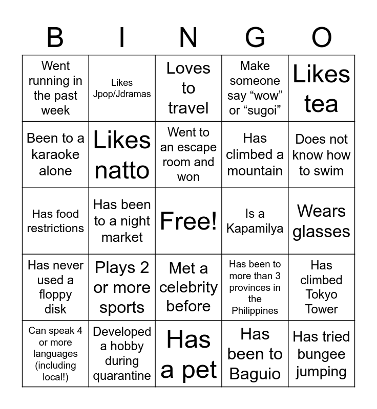 This bingo card has a free space and 51 words: Been to a Japanese nomikai, Has tried bungee jumping, Knows how to swim, Has a pet, Plays 2 or more sports, Has used a typewriter, Likes Jpop/Jdramas, Been to a yakiniku alone, Been to a karaoke alone, Has tried snowboarding/skiing, Likes natto, Make someone say “wow” or “sugoi”, Has climbed Tokyo Tower, Has been to more than 3 provinces in the Philippines, Likes balut, Has been to Boracay, Went to an escape room and won, Is a Kapamilya, Is a Kapuso, Likes tea, Has been to a night market, Has been to Baguio, Went running in the past week, Has climbed a mountain, Witnessed a Shibuya meltdown, Never been to a karaoke, Does not know how to swim, Has been to both Disney Land and Sea, Can speak 4 or more languages (including local!), Loves to travel, Has been to Japan, Does not drink alcohol, Only drinks coffee black, Is a plantita, Baked something during quarantine, Developed a hobby during quarantine, Likes pineapples on pizza, Is left-handed, Plays 2 or more musical instruments, Like Kpop/Kdramas, Wears glasses, Has never used a floppy disk, Been to Kyoto, Has never been to any DisneyLand, Does not know how to ride a bike, Does not drink coffee, Has food restrictions, Made a Tiktok during quarantine, Has a Youtube channel, Met a celebrity before and Likes spicy food.