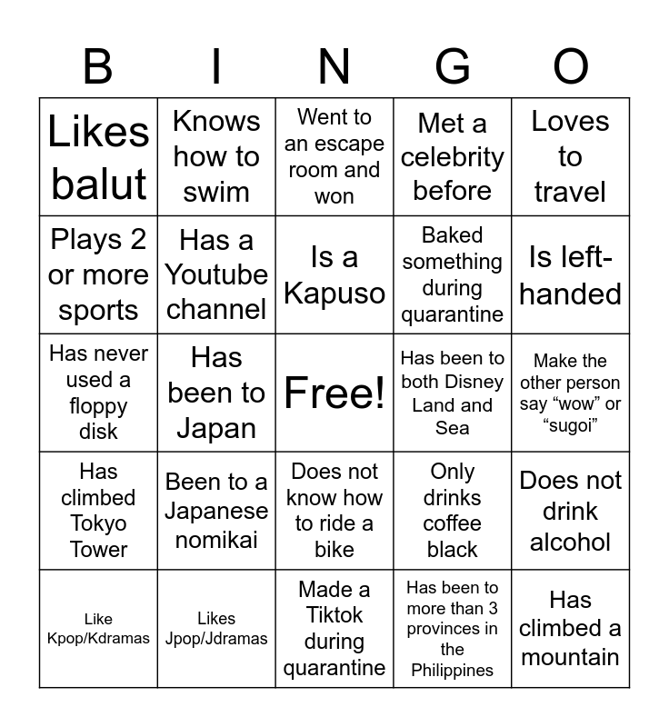 This bingo card has a free space and 51 words: Has been to Boracay, Has climbed a mountain, Has food restrictions, Made a Tiktok during quarantine, Been to a Japanese nomikai, Has tried bungee jumping, Knows how to swim, Has a pet, Plays 2 or more sports, Has used a typewriter, Has a Youtube channel, Met a celebrity before, Does not drink alcohol, Only drinks coffee black, Is a plantita, Likes spicy food, Is a Kapuso, Has been to both Disney Land and Sea, Can speak 4 or more languages (including local!), Loves to travel, Has been to Japan, Has been to more than 3 provinces in the Philippines, Likes balut, Baked something during quarantine, Developed a hobby during quarantine, Likes pineapples on pizza, Is left-handed, Plays 2 or more musical instruments, Like Kpop/Kdramas, Went to an escape room and won, Is a Kapamilya, Likes tea, Has been to a night market, Has been to Baguio, Went running in the past week, Likes Jpop/Jdramas, Been to a yakiniku alone, Been to a karaoke alone, Has tried snowboarding/skiing, Likes natto, Make the other person say “wow” or “sugoi”, Has climbed Tokyo Tower, Witnessed a Shibuya meltdown, Never been to a karaoke, Does not know how to swim, Wears glasses, Has never used a floppy disk, Been to Kyoto, Has never been to any DisneyLand, Does not know how to ride a bike and Does not drink coffee.