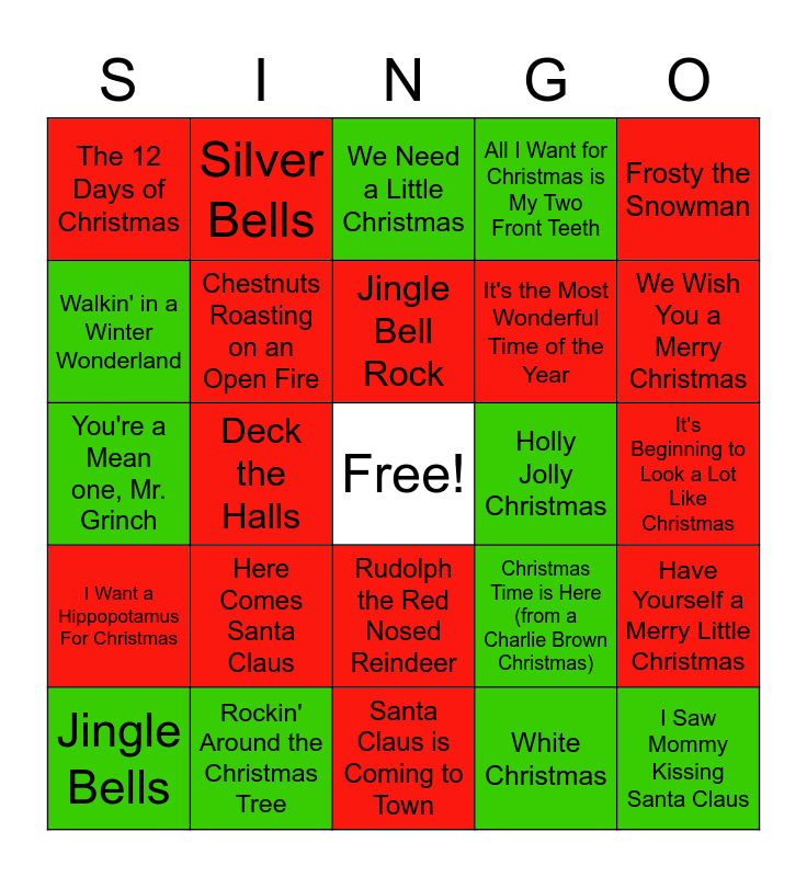This bingo card has a free space and 24 words: Here Comes Santa Claus, Rockin' Around the Christmas Tree, Jingle Bell Rock, Jingle Bells, Frosty the Snowman, The 12 Days of Christmas, Walkin' in a Winter Wonderland, Silver Bells, Holly Jolly Christmas, Rudolph the Red Nosed Reindeer, It's the Most Wonderful Time of the Year, You're a Mean one, Mr. Grinch, Christmas Time is Here (from a Charlie Brown Christmas), Have Yourself a Merry Little Christmas, Chestnuts Roasting on an Open Fire, White Christmas, It's Beginning to Look a Lot Like Christmas, We Need a Little Christmas, We Wish You a Merry Christmas, Deck the Halls, I Saw Mommy Kissing Santa Claus, I Want a Hippopotamus For Christmas, All I Want for Christmas is My Two Front Teeth and Santa Claus is Coming to Town.