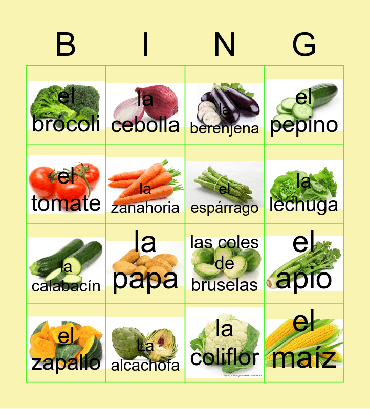 This bingo card has 16 images and 16 words: La alcachofa, el apio, la berenjena, el brócoli, la calabacín, la cebolla, las coles de bruselas, la coliflor, el tomate, la zanahoria, el zapallo, el pepino, la papa, la lechuga, el espárrago and el maíz.