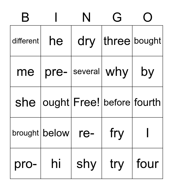 This bingo card has a free space and 39 words: co-, de-, e-, pre-, pro-, re-, several, thought, bought, brought, ought, three, four, fourth, before, below, between, different, be, fry, me, shy, why, by, go, my, sky, ye, cry, he, no, so, dry, hi, try, fly, I, she and we.