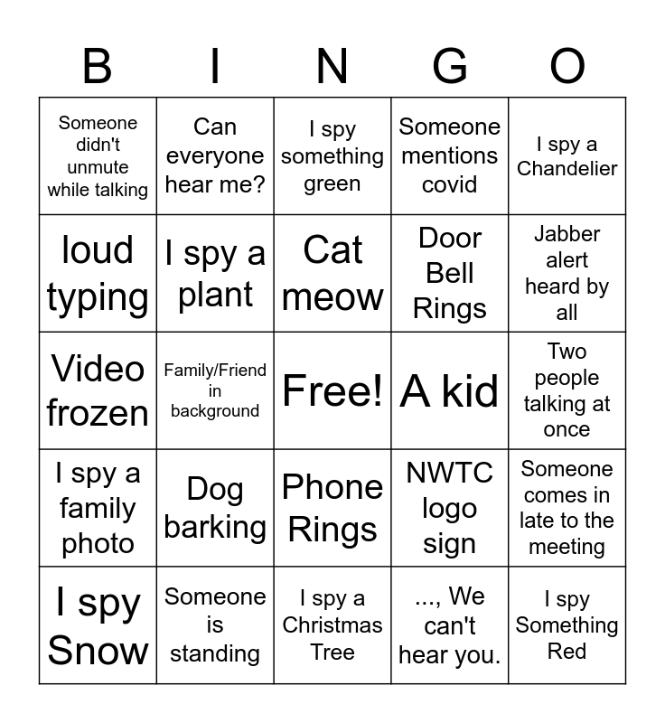 This bingo card has a free space and 25 words: Dog barking, I spy a Christmas Tree, Cat meow, I spy Snow, I spy a Chandelier, Someone didn't unmute while talking, loud typing, Can everyone hear me?, A kid, Phone Rings, Door Bell Rings, Video frozen, NWTC logo sign, Someone comes in late to the meeting, I spy a plant, Someone drinking coffee, Two people talking at once, I spy something green, Jabber alert heard by all, Family/Friend in background, I spy Something Red, Someone is standing, I spy a family photo, Someone mentions covid and ..., We can't hear you..