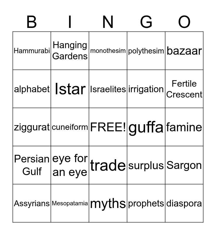 This bingo card has a free space and 24 words: eye for an eye, Mesopatamia, Israelites, Assyrians, bazaar, Hammurabi, alphabet, Hanging Gardens, guffa, trade, irrigation, ziggurat, surplus, Sargon, Istar, prophets, famine, monothesim, Fertile Crescent, cuneiform, diaspora, Persian Gulf, polythesim and myths.