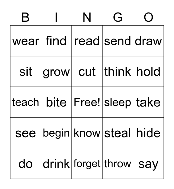 This bingo card has a free space and 24 words: begin, drink, cut, do, draw, wear, sit, find, sleep, know, think, teach, steal, hide, grow, throw, take, read, hold, bite, say, see, send and forget.