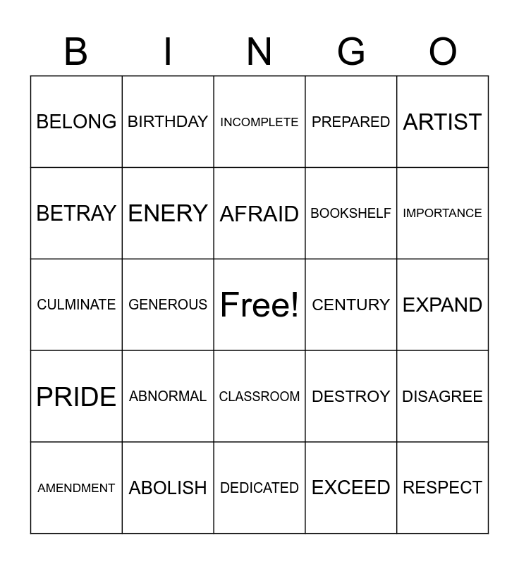 This bingo card has a free space and 24 words: ABNORMAL, ABOLISH, AFRAID, AMENDMENT, ARTIST, BELONG, BETRAY, BIRTHDAY, CENTURY, CLASSROOM, BOOKSHELF, CULMINATE, DESTROY, DISAGREE, ENERY, EXCEED, EXPAND, INCOMPLETE, IMPORTANCE, GENEROUS, RESPECT, PRIDE, PREPARED and DEDICATED.
