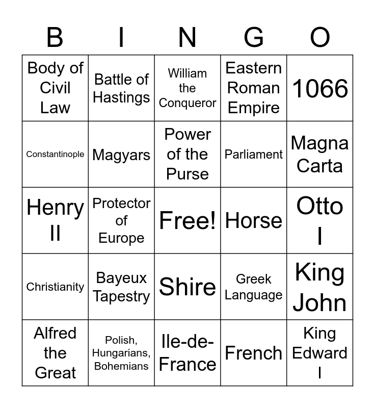 This bingo card has a free space and 24 words: Bayeux Tapestry, Polish, Hungarians, Bohemians, Power of the Purse, Alfred the Great, 1066, Body of Civil Law, Constantinople, Battle of Hastings, Horse, Shire, Parliament, Henry II, Greek Language, King John, Magyars, French, Otto I, William the Conqueror, Magna Carta, Protector of Europe, King Edward I, Christianity, Eastern Roman Empire and Ile-de-France.