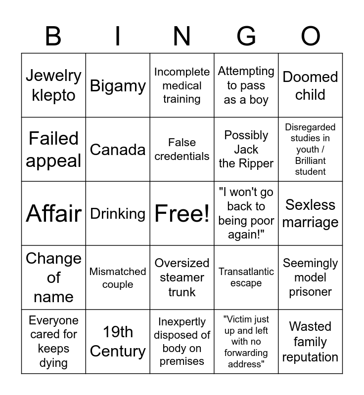 This bingo card has a free space and 24 words: Mismatched couple, 19th Century, False credentials, Everyone cared for keeps dying, Doomed child, Jewelry klepto, Failed appeal, Bigamy, "I won't go back to being poor again!", Oversized steamer trunk, Possibly Jack the Ripper, Affair, Transatlantic escape, Seemingly model prisoner, Canada, "Victim just up and left with no forwarding address", Sexless marriage, Incomplete medical training, Disregarded studies in youth / Brilliant student, Drinking, Wasted family reputation, Change of name, Attempting to pass as a boy and Inexpertly disposed of body on premises.