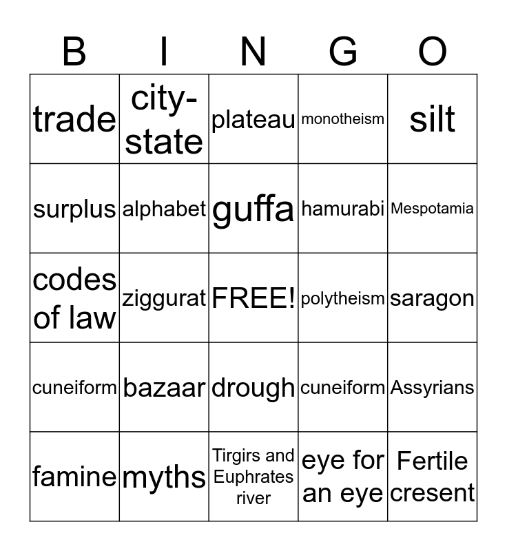 This bingo card has a free space and 24 words: bazaar, myths, guffa, famine, silt, trade, surplus, city- state, polytheism, drough, hamurabi, codes of law, cuneiform, Assyrians, alphabet, eye for an eye, saragon, plateau, Mespotamia, ziggurat, Fertile cresent, cuneiform, monotheism and Tirgirs and Euphrates river.