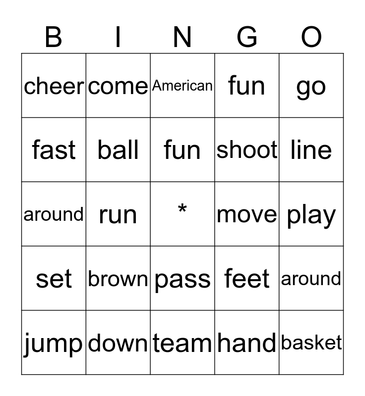 This bingo card has a free space and 24 words: brown, down, fun, jump, go, cheer, fast, come, move, pass, shoot, around, feet, around, ball, hand, play, American, line, run, basket, set, fun and team.