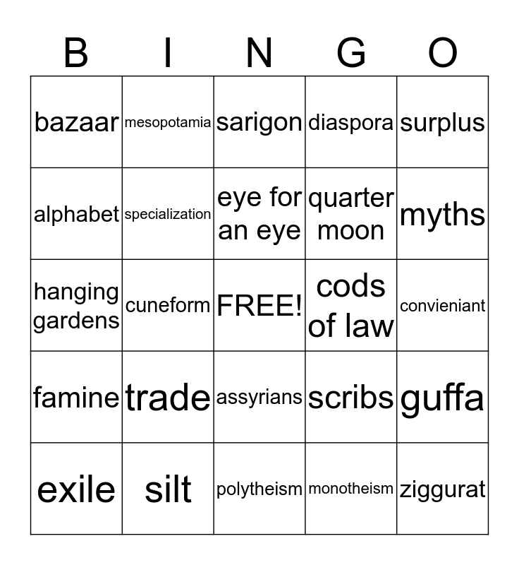This bingo card has a free space and 24 words: trade, silt, eye for an eye, exile, surplus, bazaar, alphabet, mesopotamia, cods of law, assyrians, quarter moon, hanging gardens, scribs, guffa, specialization, monotheism, convieniant, sarigon, myths, cuneform, ziggurat, famine, diaspora and polytheism.