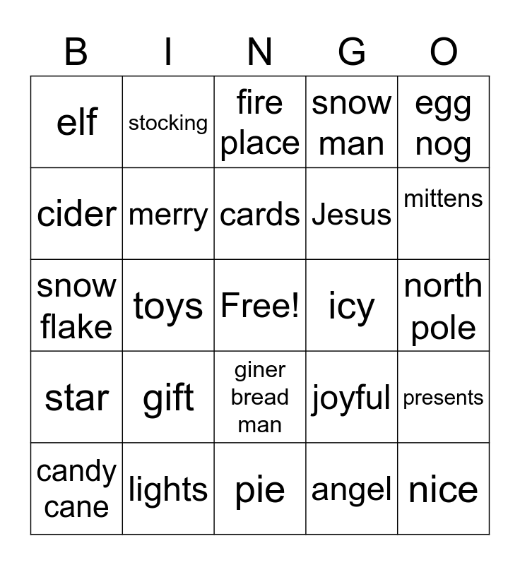 This bingo card has a free space and 24 words: gift, lights, cards, candy cane, egg nog, elf, cider, stocking, icy, giner bread man, Jesus, snow flake, joyful, presents, merry, angel, north pole, fire place, mittens, toys, nice, star, snow man and pie.
