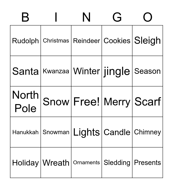 This bingo card has a free space and 27 words: Candle, Fireplace, jingle, Ornaments, Santa, Reindeer, Christmas, Hanukkah, Merry, Chimney, North Pole, Cookies, Holiday, Wreath, Season, Vacation, Kwanzaa, Winter, Snowman, Rudolph, Scarf, Sledding, Snow, Presents, Lights, Sleigh and Garland.