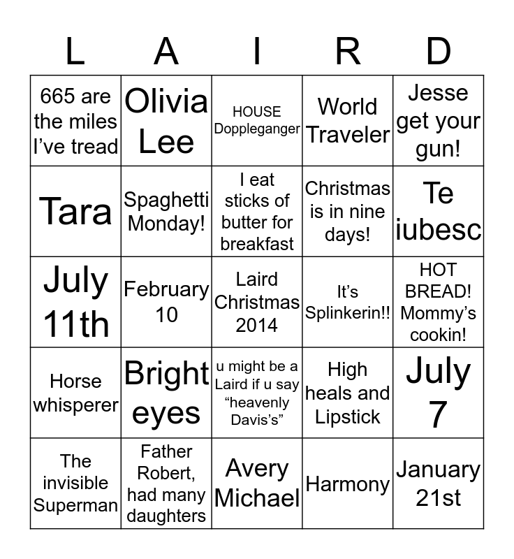 This bingo card has a free space and 34 words: The Big one that got away, Harmony, To live, would be an awfully big adventure.., Who let the dogs out?!, Horse whisperer, Spaghetti Monday!, Jesse get your gun!, The invisible Superman, Olivia Lee, Seven Brides for seven lucky guys, I eat sticks of butter for breakfast, HOUSE Doppleganger, Don’t cry over lost brows, Scold, scold, scold, scold, scold..., It’s Splinkerin!!, Te iubesc, Father Robert, had many daughters, July 11th, Bright eyes, High heals and Lipstick, u might be a Laird if u say “heavenly Davis’s”, All because two people fell in love, 665 are the miles I’ve tread, HOT BREAD! Mommy’s cookin!, Avery Michael, January 21st, World Traveler, March 23rd, Christmas is in nine days!, Tara, Biscuits and Gravy!, February 10, July 7 and August 31.