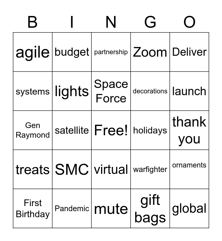 This bingo card has a free space and 24 words: SMC, Pandemic, Space Force, First Birthday, Deliver, agile, systems, budget, holidays, virtual, decorations, Gen Raymond, warfighter, ornaments, lights, gift bags, thank you, partnership, launch, satellite, global, treats, Zoom and mute.