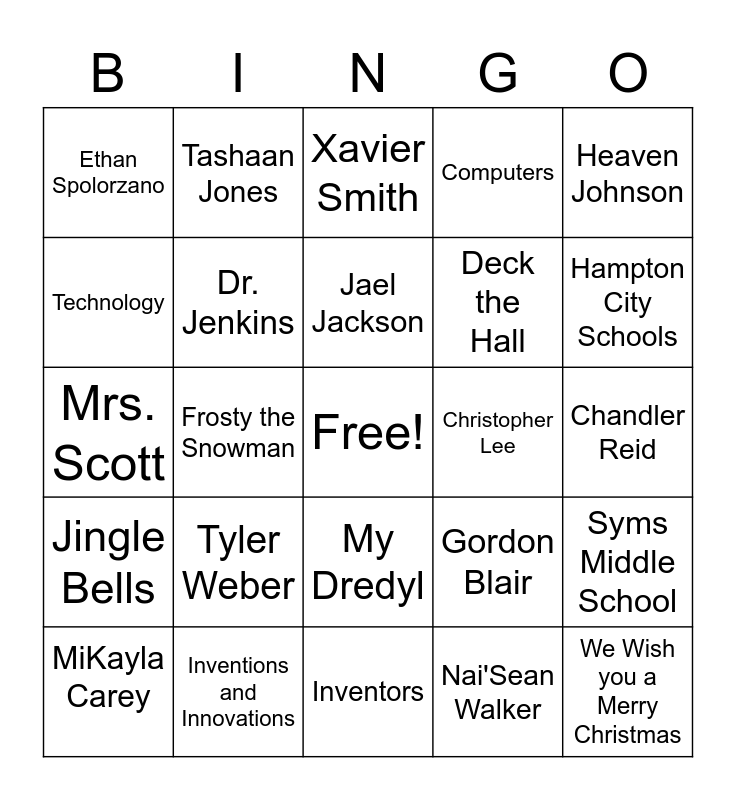 This bingo card has a free space and 24 words: MiKayla Carey, Tyler Weber, Jael Jackson, Nai'Sean Walker, Heaven Johnson, Ethan Spolorzano, Tashaan Jones, Xavier Smith, Christopher Lee, Chandler Reid, Mrs. Scott, Dr. Jenkins, Gordon Blair, Syms Middle School, Technology, Inventions and Innovations, Inventors, Computers, Hampton City Schools, Jingle Bells, Frosty the Snowman, My Dredyl, Deck the Hall and We Wish you a Merry Christmas.
