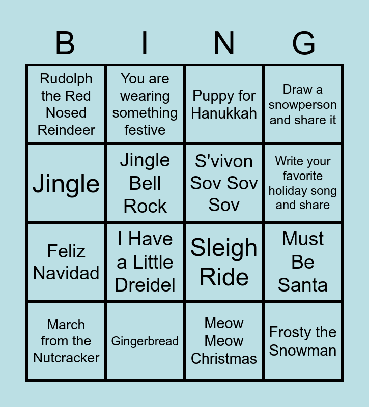 This bingo card has 19 words: Sleigh Ride, Let It Snow, Puppy for Hanukkah, Frosty the Snowman, Must Be Santa, Jingle, Meow Meow Christmas, Rudolph the Red Nosed Reindeer, You are wearing something festive, Feliz Navidad, I Have a Little Dreidel, Jingle Bell Rock, S'vivon Sov Sov Sov, Gingerbread, March from the Nutcracker, A Season for Singing, Draw a snowperson and share it, Write your favorite holiday song and share and draw a snowflake and share it.