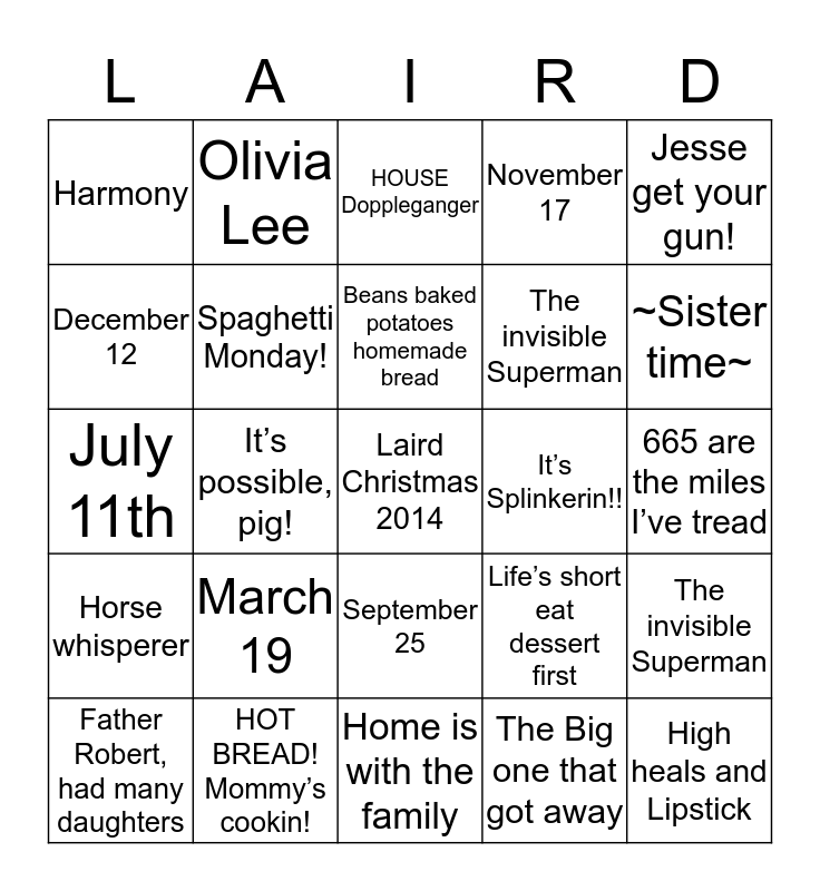 This bingo card has a free space and 32 words: The Big one that got away, Sabine Women, It’s possible, pig!, Aaaaas yoooou wiiiish...., Horse whisperer, Spaghetti Monday!, Jesse get your gun!, The invisible Superman, Olivia Lee, I love you forever, I like you for always, Beans baked potatoes homemade bread, HOUSE Doppleganger, Don’t cry over lost brows, Scold, scold, scold, scold, scold..., It’s Splinkerin!!, Te iubesc, Father Robert, had many daughters, July 11th, September 25, March 19, Life’s short eat dessert first, September 15, 665 are the miles I’ve tread, HOT BREAD! Mommy’s cookin!, High heals and Lipstick, November 17, The invisible Superman, December 12, Harmony, Home is with the family, December 25 and ~Sister time~.