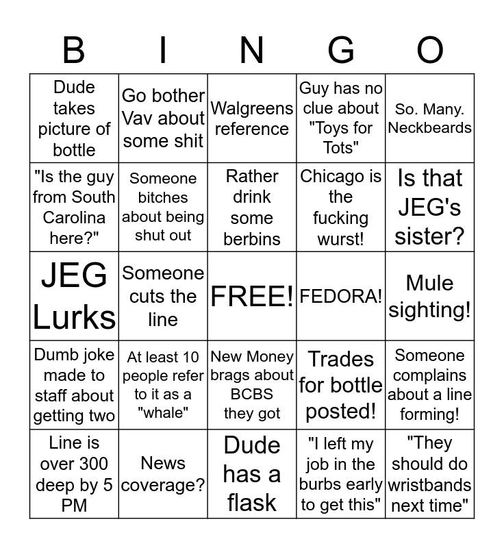 This bingo card has a free space and 24 words: At least 10 people refer to it as a "whale", News coverage?, Rather drink some berbins, Line is over 300 deep by 5 PM, So. Many. Neckbeards, Dude takes picture of bottle, "Is the guy from South Carolina here?", Go bother Vav about some shit, FEDORA!, New Money brags about BCBS they got, Chicago is the fucking wurst!, JEG Lurks, Trades for bottle posted!, Someone complains about a line forming!, Someone bitches about being shut out, "I left my job in the burbs early to get this", Mule sighting!, Walgreens reference, Is that JEG's sister?, Someone cuts the line, "They should do wristbands next time", Dumb joke made to staff about getting two, Guy has no clue about "Toys for Tots" and Dude has a flask.